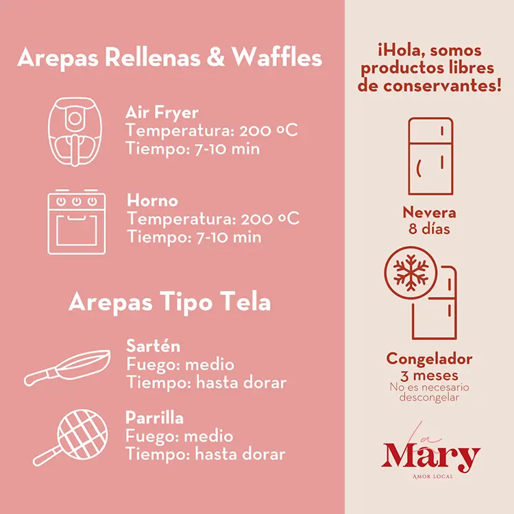 Ingredientes naturales: Las arepas están hechas con ingredientes simples y naturales como maíz, chocolo (maíz tierno), agua, queso, polvo para hornear y sal, lo que las hace una opción más saludable y libre de aditivos artificiales.