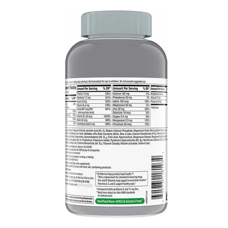 Centrum Silver Adults 50+ 325 Tab es un multivitamínico diseñado para apoyar la energía, la inmunidad y la salud del corazón, huesos y vista en adultos mayores de 50 años. Con vitaminas y minerales esenciales como D3, B12, zinc y luteína, te ayuda a mantener un bienestar integral con solo una tableta al día. ¡Ideal para seguir activo y sentirte mejor cada día!