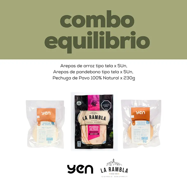 Combo Equilibrio Yen x La Rambla: Una opción ideal para quienes buscan combinar sabor, proteína y practicidad en su día a día. Este combo reúne dos variedades de arepas Yen, elaboradas con ingredientes naturales, junto con una pechuga de pavo 100% natural, perfecta para preparar desayunos o cenas rápidas y nutritivas en minutos.