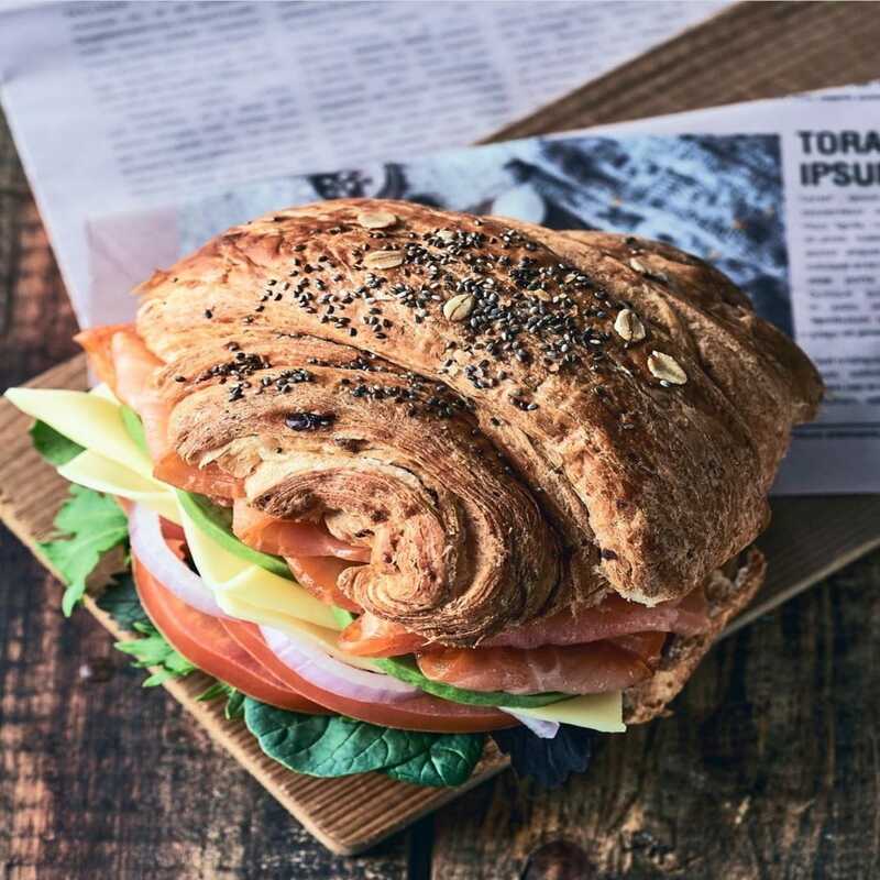 Croissant hojaldrado, elaborado a partir de harina integral y harina de centeno, endulzado con miel y azúcar morena.